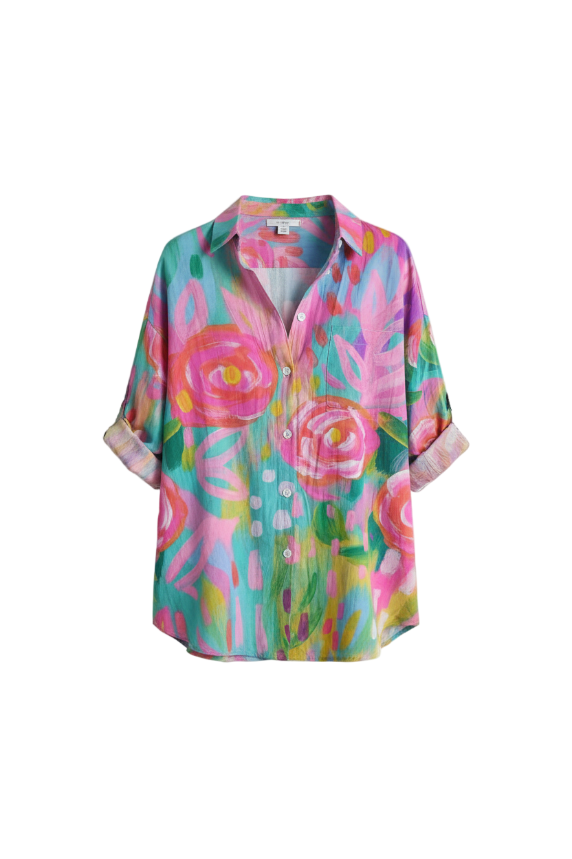 Diese Bluse ist ein echter Blickfang! Mit ihrem farbenfrohen und künstlerischen Print verleiht sie Ihrer Garderobe einen verspielten und einzigartigen Ausdruck. Die bequeme Passform und das luftige Material machen sie ideal für lässige und schicke Anlässe.