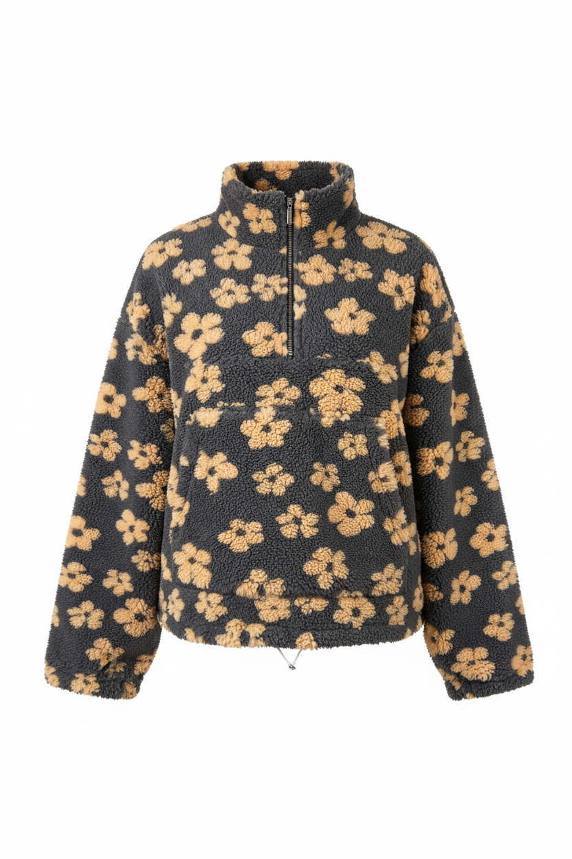 • Design: Halber Reißverschluss, Stehkragen, leicht oversized-Passform und florales Muster.