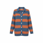 Die Livia Bluse hat eine Kombination aus tiefblau und warmem Orange in breiten, horizontalen Streifen. Die Farben sorgen für ein lebendiges, aber dennoch ausgewogenes Gesamtbild. Die weißen Knöpfe und der klassische Kragen verleihen dem Design eine frische, gepflegte Ausstrahlung.