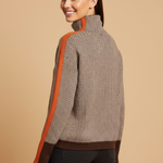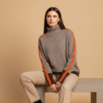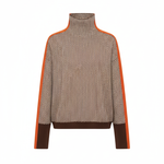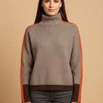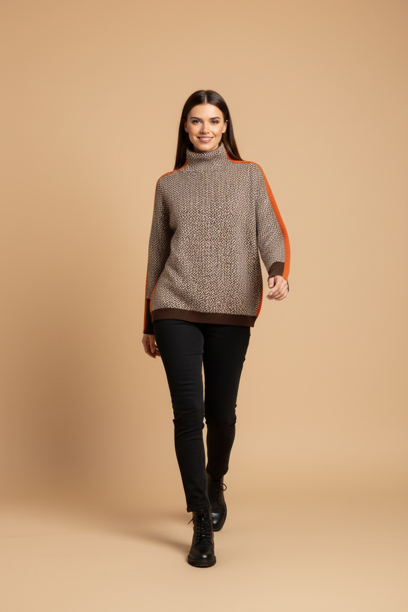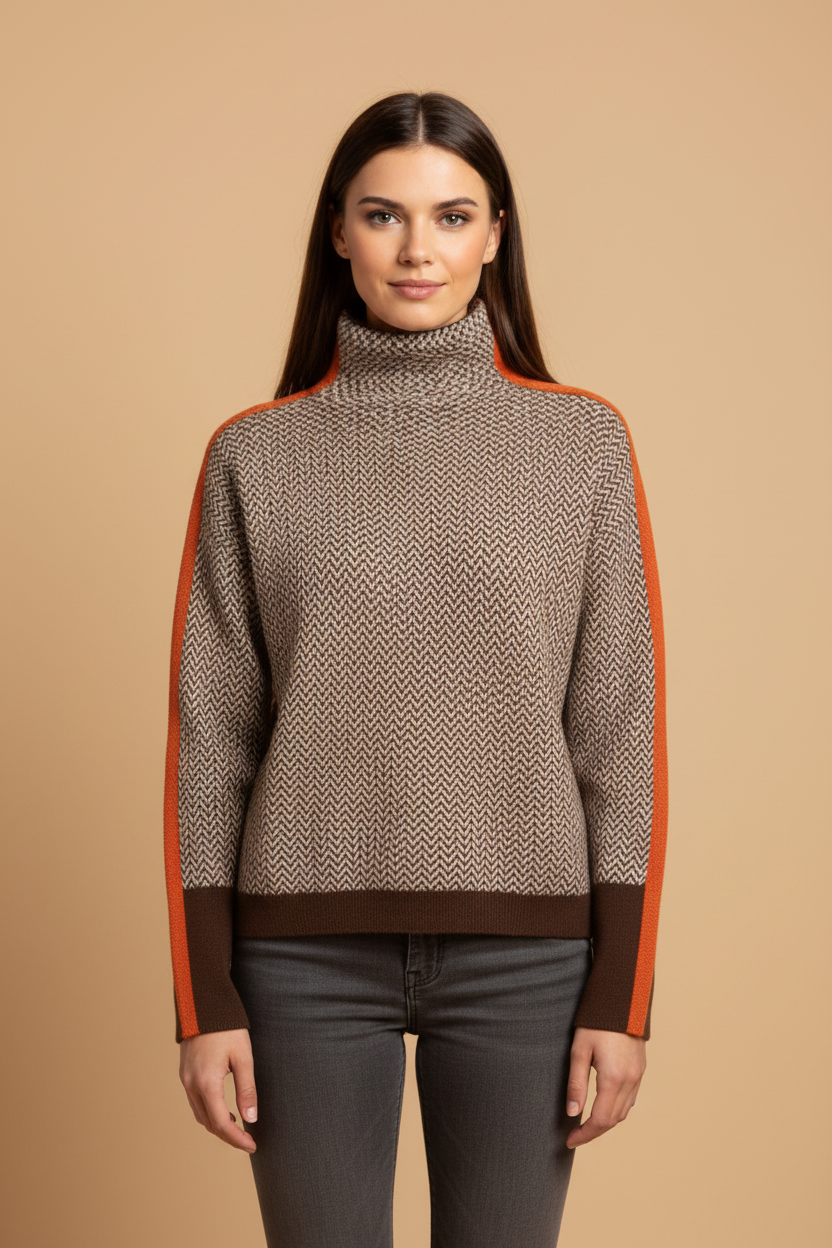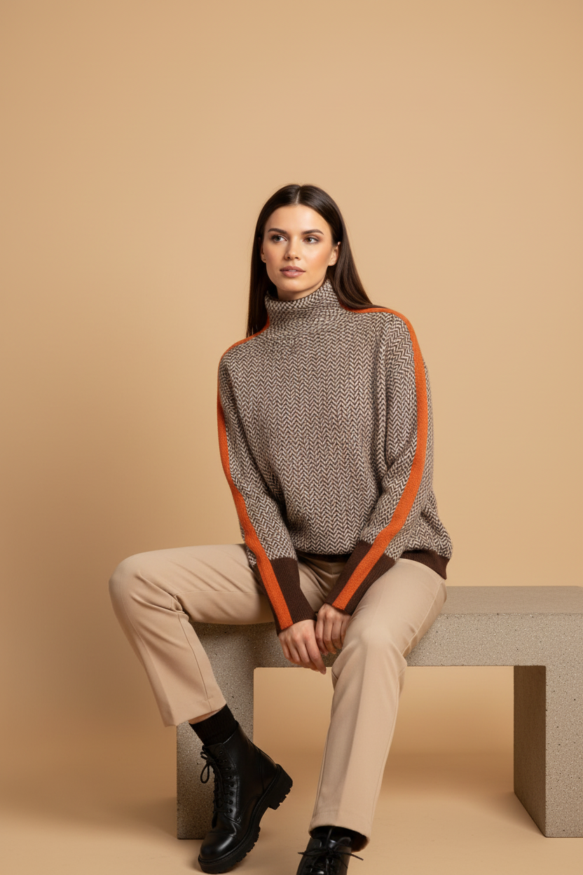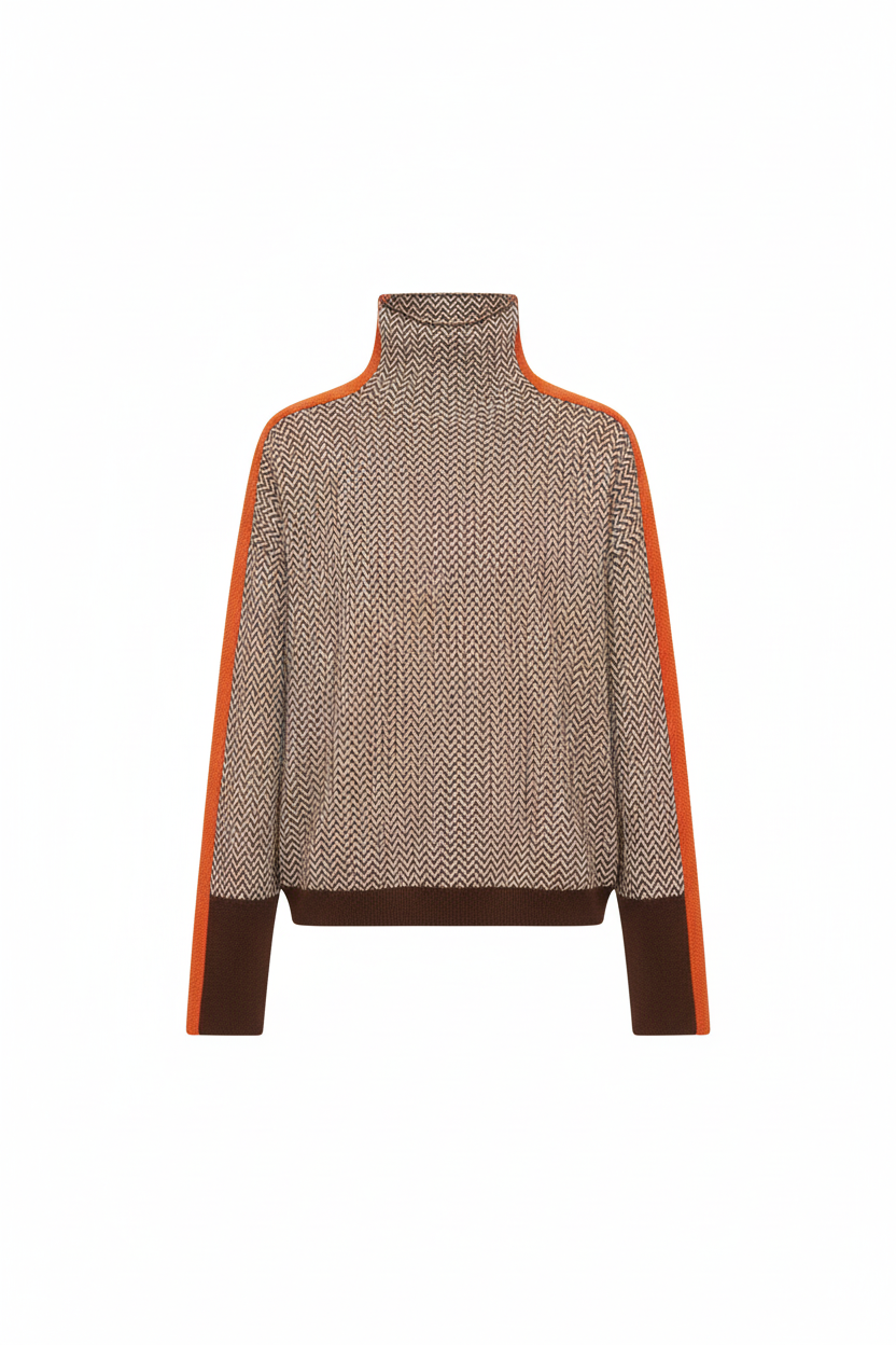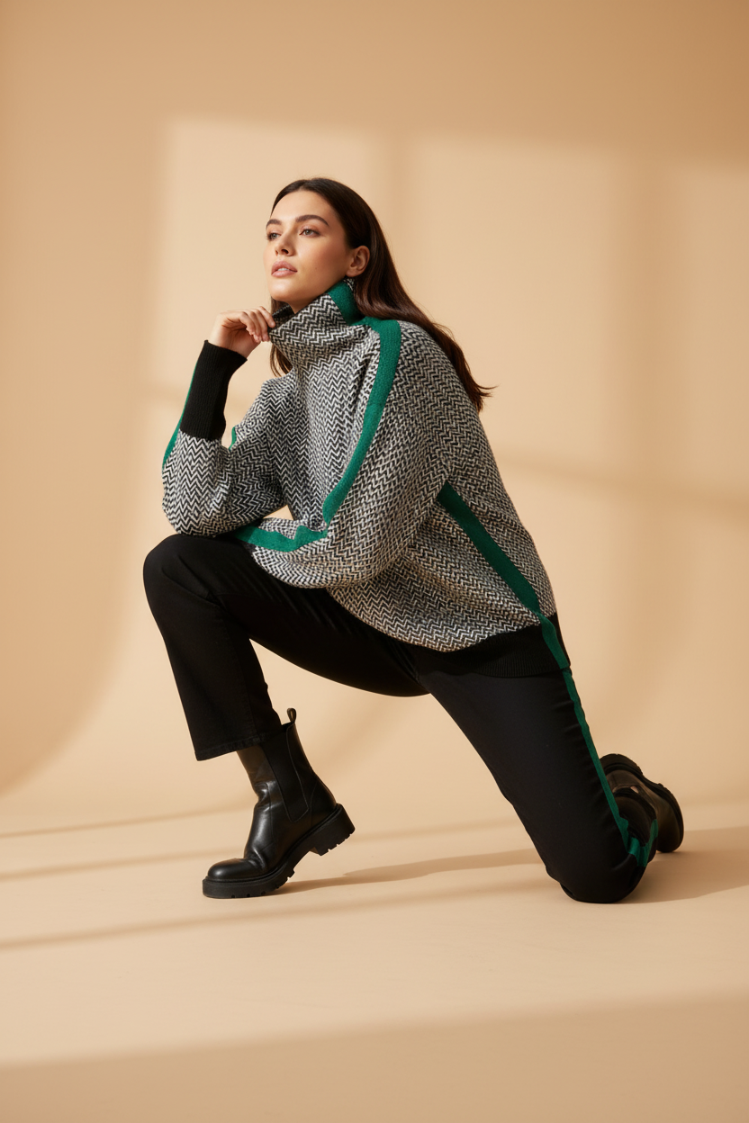 Design: Hoher Rollkragen, lange Ärmel, strukturiertes Muster und kontrastierende Seitenstreifen.